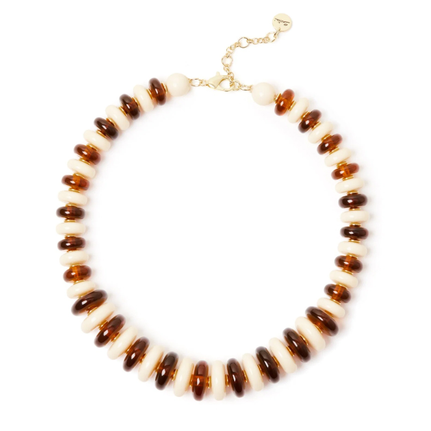 Un accessorio intrigante dai toni splendenti dell’avorio, tartaruga e oro, perfetto con qualunque outfit. Targhetta Sodini sulla catenina di estensione.